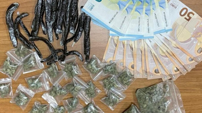 I poliziotti hanno raggiunto e bloccato l’indagato trovandolo in possesso di 25 bustine contenenti 50 grammi circa di marijuana, 17 stecche di hashish del peso complessivo di circa 107 grammi e 830 euro, suddivisi in banconote di vario taglio.