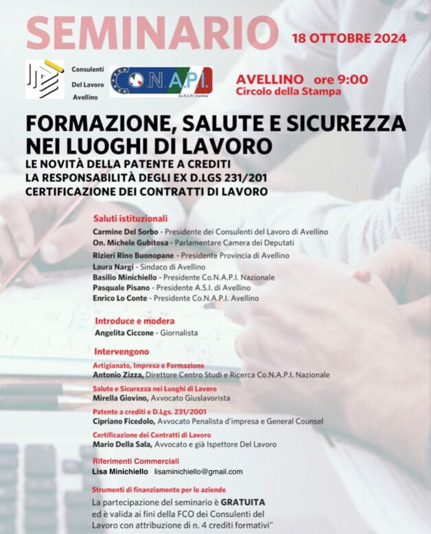 Il 18 ottobre 2024, presso il Circolo della Stampa di Avellino, si terrà un importante seminario dal titolo “Formazione, salute e sicurezza nei luoghi di lavoro. Responsabilità degli enti ex D.Lgs. 231/2001 e le novità della patente a crediti”. L’evento, che avrà inizio alle ore 9.00, sarà un’opportunità significativa per discutere temi cruciali come la sicurezza sul lavoro, le responsabilità degli enti in base al D.Lgs. 231/2001 e le recenti innovazioni normative relative alla patente a crediti.