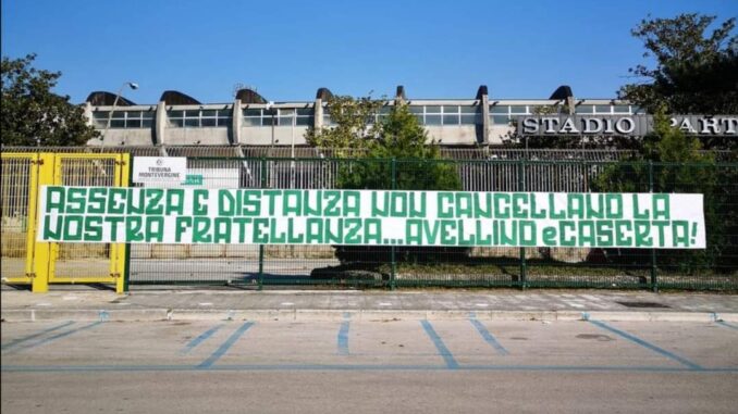 Stasera al “Pinto” andrà in scena il derby tra Casertana e Avellino. Appuntamento alle 20,30. I tifosi ovviamente non saranno presenti per l’emergenza Covid, quelli casertani e quelli avellinesi hanno voluto rinsaldare e ribadire il gemellaggio che li lega. Dinanzi alla Tribuna Montevergine dello Stadio Partenio Lombardi ecco lo striscione dei sostenitori biancoverdi: “Assenza e distanza non cancellano la nostra fratellanza…Avellino e Caserta!”