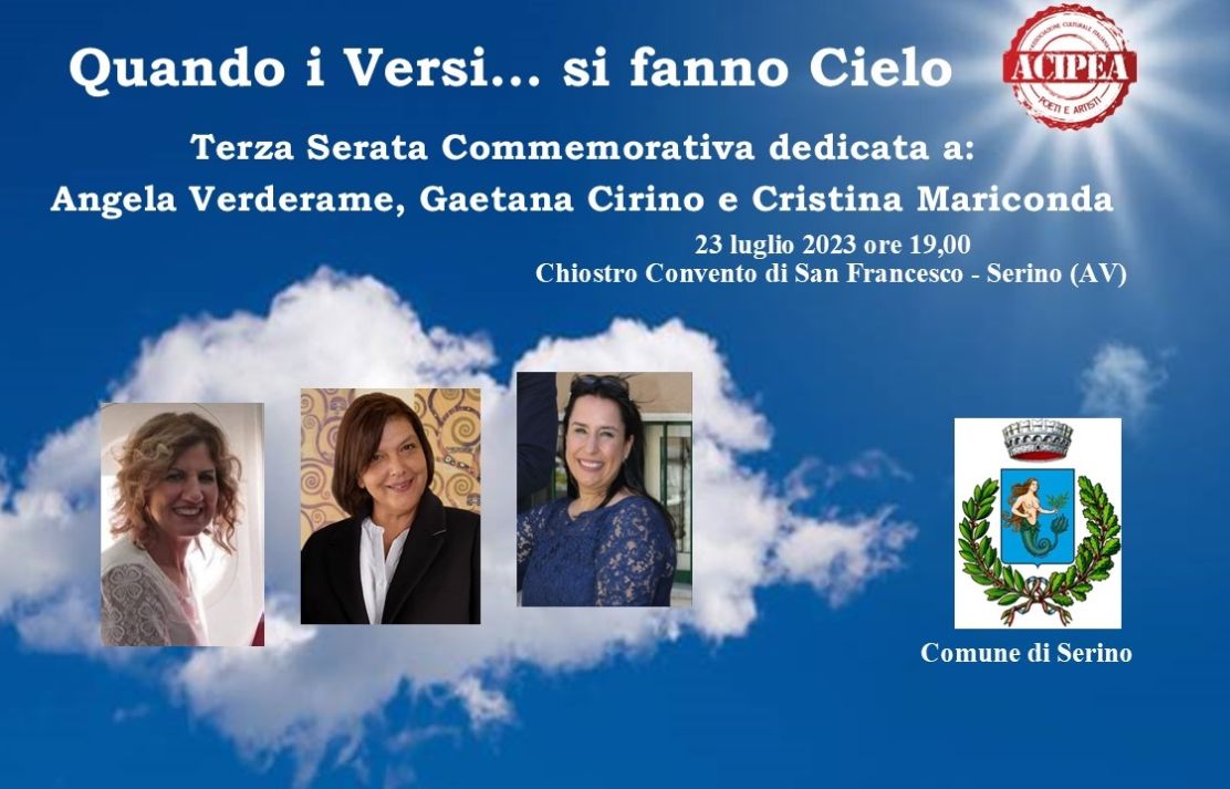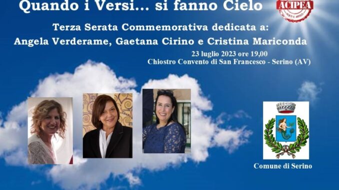 II Serata Commemorativa domenica 23 luglio ore 19.00 Chiostro di San Francesco di Serino, dedicata alle care Angela Verderame, Gaetana Cirino e Cristina Mariconda, tre Donne straordinarie che ci hanno lasciato improvvisamente, segnando in modo indelebile le nostre vite.