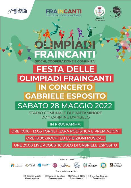 A conclusione della settimana di gare con protagonisti bambini e ragazzi delle scuole dell’area nord di Napoli, sabato 28 maggio allo Stadio Comunale di Frattaminore è in programma la FESTA DELLE OLIMPIADI FRAINCANTI, una giornata ricca di eventi rivolta a tutta la cittadinanza. Giunta alla seconda edizione, l’iniziativa è promossa dal Comune di Frattaminore e dalla rete di partner del progetto “Fraincanti”, selezionato da Con i Bambini nell’ambito del Fondo per il contrasto della povertà educativa minorile.