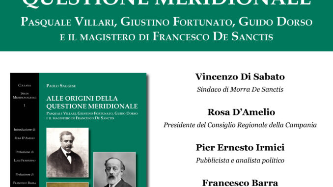 Prima presentazione per la nuova pubblicazione di Paolo Saggese, Alle origini della questione meridionale. Pasquale Villari, Giustino Fortunato, Guido Dorso e il magistero di Francesco De Sanctis (Terebinto Edizioni, pp. 144, 15 euro, già disponibile in libreria e in edicola).