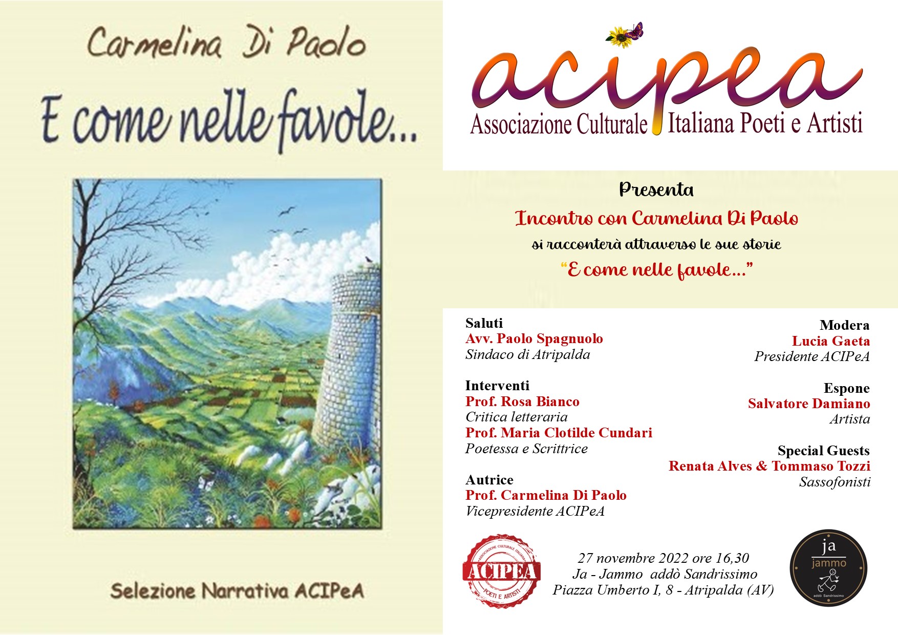 Si presenterà domenica 27 novembre ore 16,30 l’incontro con l’autore con la prof. Carmelina Di Paolo, già vicepresidente di ACIPeA, che parlerà del suo libro di narrativa “E come nelle favole…”, sei racconti brevi a lieto fine accompagnati da sei meravigliose opere dell’artista Salvatore Damiano da Altavilla Silentina (SA) che espone i suoi lavori.