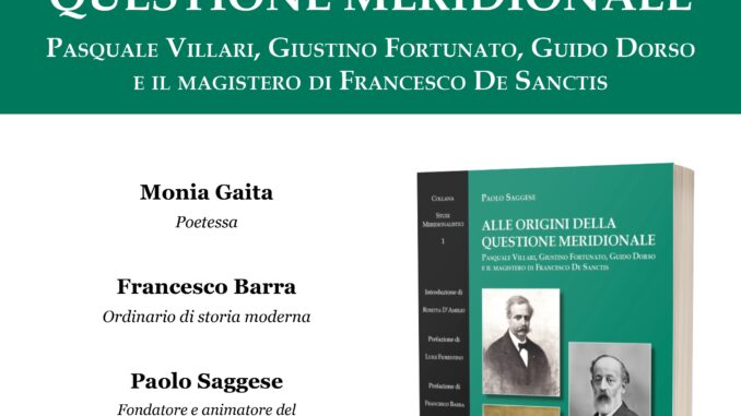 Dopo la presentazione tenuta a Morra De Sanctis lo scorso 18 agosto, che ha visto – con grande partecipazione di pubblico – tra i relatori il Presidente del Consiglio Regionale della Campania, Rosa D’Amelio, e il vice Sindaco di Morra De Sanctis, Enrico Indelli, arriva finalmente anche nel capoluogo il nuovo libro di Paolo Saggese: Alle origini della questione meridionale. Pasquale Villari, Giustino Fortunato, Guido Dorso e il magistero di Francesco De Sanctis (Terebinto Edizioni, pp. 144, 15 euro, già disponibile in libreria e in edicola).