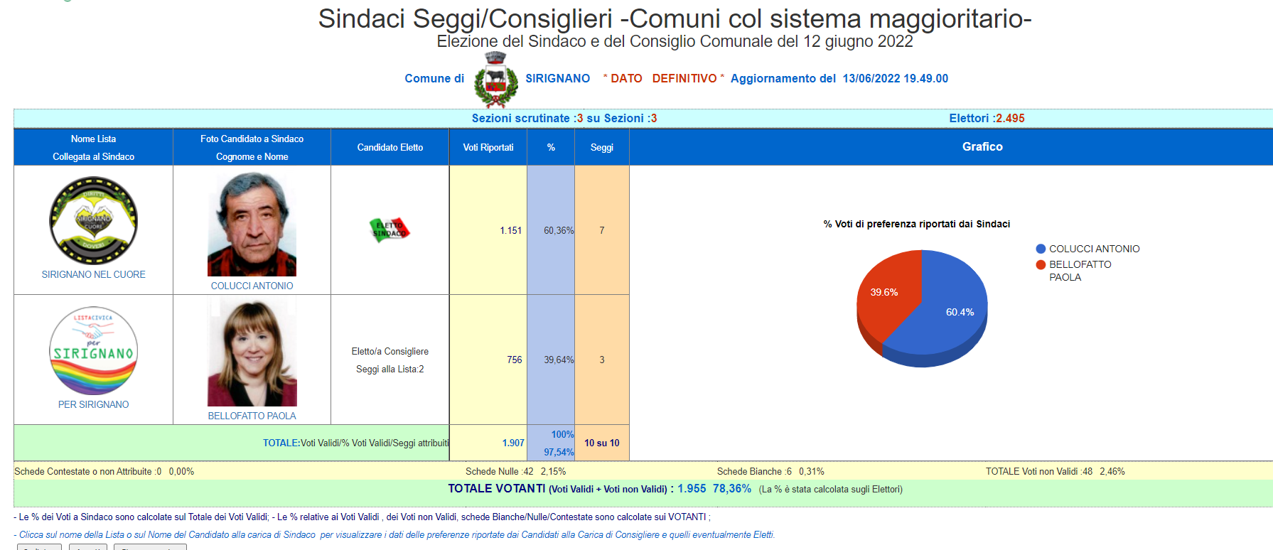 SIRIGNANO. Antonio Colucci vince con un margine di 395 voti 13/06/2022 binews.it ATTUALITA', EVIDENZA, SIRIGNANO 0 Vittoria netta a Sirignano per la lista capeggiata da Antonio Colucci che distanzia l’avversaria Paola Bellofatto per 395 voti.