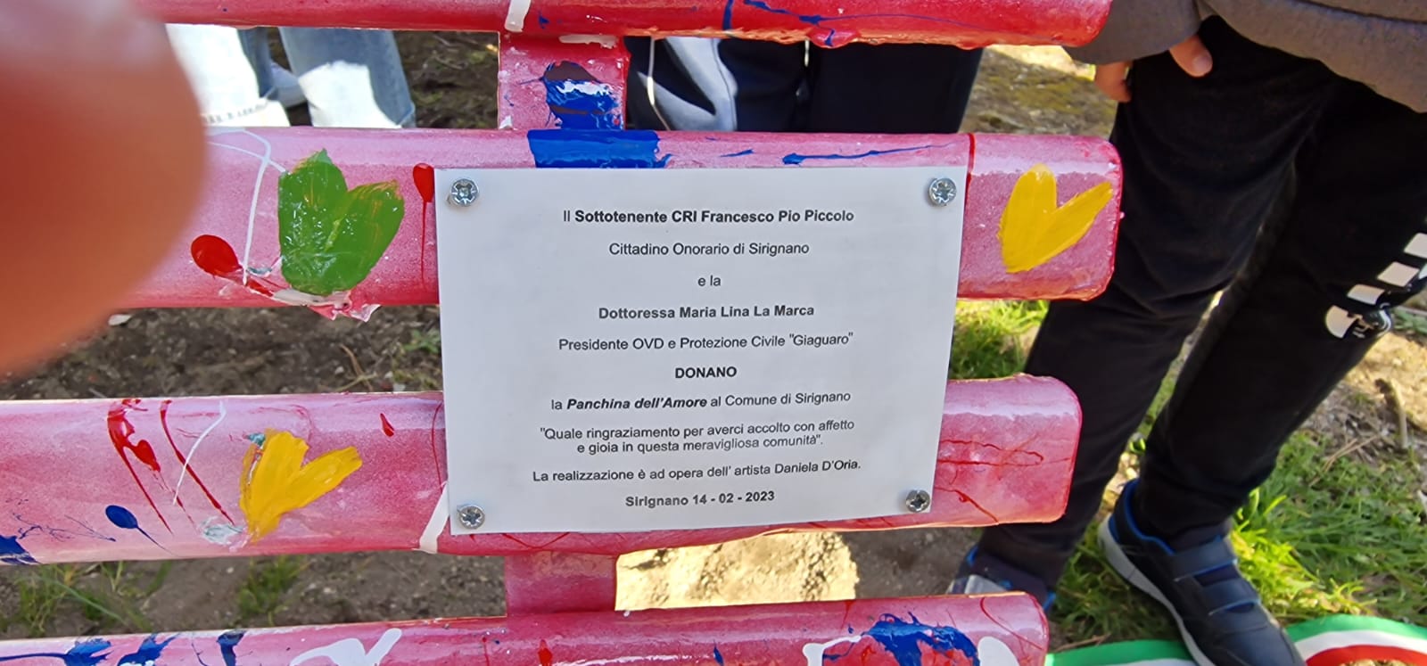 Questa mattina a Sirignano presso la Villa Comunale è stata inaugurata la Panchina dell’Amore in occasione proprio della festa degli innamorati. Un’iniziativa voluta da due cittadini onorari del paese, ovvero Francesco Pio Piccolo e la dott.ssa Maria Lina La Marca.