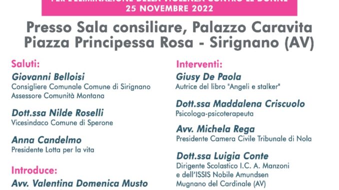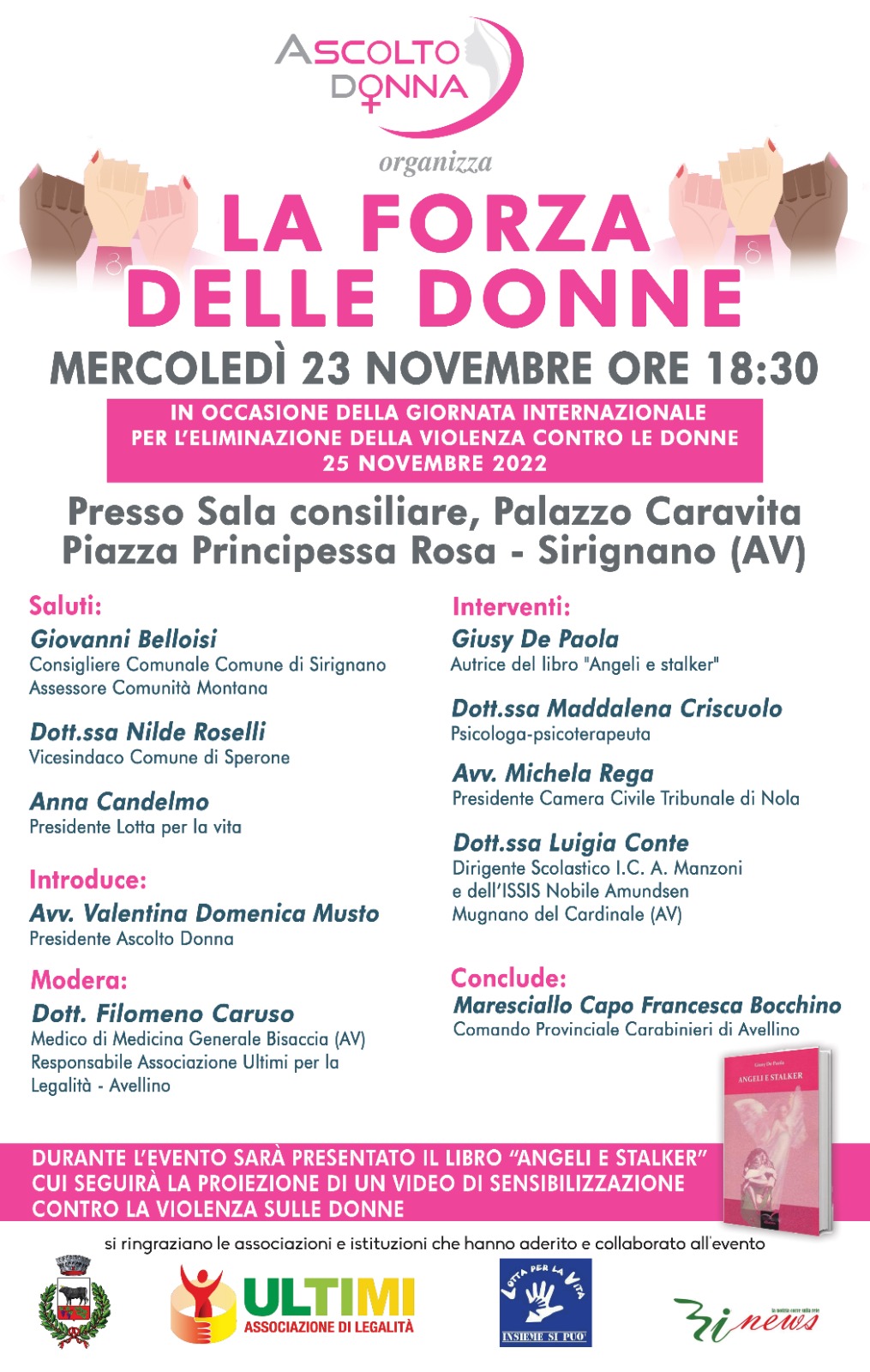L’associazione “Ascolto Donna” presenta in occasione della giornata internazionale per la eliminazione della violenza contro le donne mercoledì 23 novembre alle ore 18,30 presso il palazzo Caravita di Sirignano il dibattito dal titolo: “La Forza delle donne”. A moderare i lavori il dott. Filomeno Caruso, interverranno l’Avv. Valentina Domenica Musto, presidente dell’associazione organizzatrice, Giusy De Paola, autrice del libro “Angeli e Stalker”, la dott.ssa Maddalena Criscuolo, psicologa e psicoterapeuta, l’avv. Michele Rega, presidente della Camera Civile del Tribunale di Nola, la dott.ssa Luigia Conte, dirigente dell’I.C. “Manzoni” di Mugnano del Cardinale e il Maresciallo Capo dei Carabinieri Francesca Bocchino. Inoltre ci saranno i saluti del vice sindaco di Sperone Nilde Roselli, quelli del consigliere comunale di Sirignano Giovanni Belloisi e la presidente di “Lotta per la Vita” Anna Candelmo.