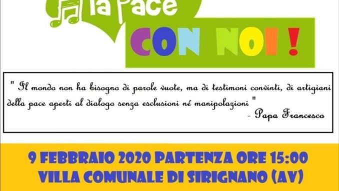 Domani a Sirignano, in occasione del mese della Pace celebrato un po’ ovunque si terrà la manifestazione “Piazza la Pace” organizzata dall’associazione cattolica mandamentale di Sirignano, Mugnano del Cardinale, Avella, Baiano e Sperone. Per l’occasione alle 15 si terrà la marcia della pace che partirà dalla villa di Sirignano e proseguirà verso la chiesa di San Andrea, per poi giungere nel campo polivalente dove ci sarà un momento di festa con tutti i ragazzi.