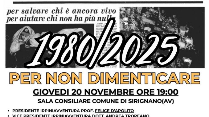 Giovedì 20 novembre, alle ore 19:00, presso la Sala Consiliare del Comune, l’Associazione Irpiniavventura, in collaborazione con l’Amministrazione Comunale, promuove un incontro dedicato alla memoria, alla testimonianza e all’approfondimento tecnico-scientifico del sisma che devastò numerosi territori del Mezzogiorno.