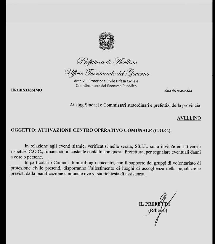AVELLINO – Dopo le scosse di terremoto che hanno interessato l’Irpinia nella serata di sabato, la Prefettura di Avellino, guidata dal prefetto Rossana Riflesso, ha inviato una circolare urgente a tutti i sindaci della provincia disponendo l’attivazione dei Centri Operativi Comunali (C.O.C.).