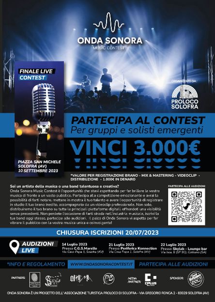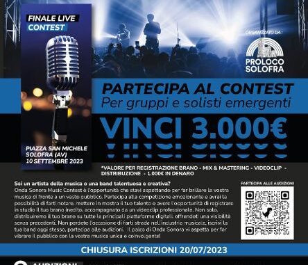Onda Sonora Music Contest è lieta di annunciare l’inizio delle audizioni per la terza edizione di questo prestigioso concorso musicale. Alla ricerca dei nuovi talenti e delle promesse della scena musicale italiana, Onda Sonora Contest offre un’opportunità unica per gli artisti emergenti di farsi conoscere e di mostrare il proprio talento al grande pubblico. La terza edizione di Onda Sonora Contest promette di essere ancora più emozionante e coinvolgente, con un fantastico premio in palio per il vincitore della finale che si terrà il 10 Settembre a Piazza San Michele a Solofra (AV). Il premio, dal valore di 3.000€ include l’incisione dell’inedito con mix e mastering a cura di Tuesday Studio, la realizzazione di un videoclip a cura di Production Brothers, la distribuzione del singolo inciso sulle maggiori piattaforme musicali digitali a cura di Oracma Studio e 1.000€ in denaro messi in palio dalla Proloco Solofra.