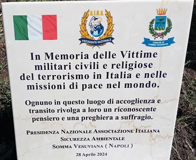 L’AISA (Associazione Italiana Sicurezza Ambientale), presieduta dal Cav. Giovanni Cimmino, ha celebrato la Festa della Repubblica del 2 Giugno con una solenne commemorazione. Lo scorso 23 maggio 2024, è stata apposta una targa in ceramica in memoria delle vittime del terrorismo presso l’Ulivo della Memoria, piantato il 28 aprile 2024 nell’Aiuola dei Caduti di Tutte le Guerre a Somma Vesuviana.