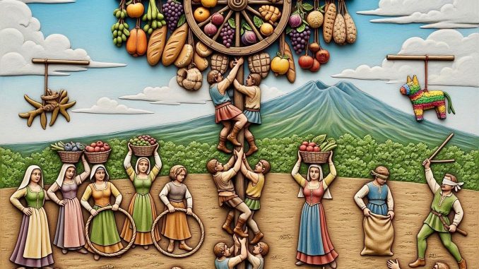 Il Palio non è solo spettacolo, ma rito collettivo. I rioni storici del paese – Prigliano, Castello, Casamale, Margherita, Starza Mercato, Carmine, Costantinopoli e Santa Maria del Pozzo – si sfideranno nei giochi popolari che hanno fatto la storia della festa: dalla corsa nei sacchi al palo di sapone, dal tradizionale curuoglio al tiro alla fune, senza dimenticare la corsa con i chirchio e la rottura della pignatta. Competizioni che, più che gare, sono pretesto di condivisione e memoria comunitaria.