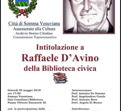 La biblioteca di Somma Vesuviana sarà intitolata a Raffaele D’Avino, uomo di cultura, illustratore del patrimonio artistico, storico e archeologico della città di Somma. A dodici anni dalla sua morte la cerimonia che si terrà giovedì 30 maggio alle ore 17 in municipio, voluta dal sindaco Salvatore Di Sarno, l’assessorato alla Cultura guidato da Flora Pirozzi, in collaborazione con l’archivio storico cittadino “Giorgio Cocozza” e la Commissione Toponomastica. Alla manifestazione sarà presente il complesso bandistico dell’associazione culturale musicale “Antonio Seraponte”, diretto dal Maestro Mauro Seraponte. A seguire un convegno nella sala consiliare, interverranno l’archeologo Antonio De Simone, l’ispettore onorario del Ministero dei Beni Culturali e Ambientali Angelandrea Casale, Antonio Bove e Angelo Di Mauro, scrittore. Saluti istituzionali del sindaco. Introdurranno l’archivista Alessandro Masulli e Antonio Terracciano componente della commissione toponomastica del Comune. Modererà la dirigente comunale Iolanda Marrazzo.