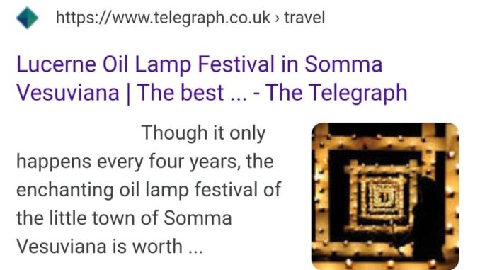 “Anche se si svolge ogni 4 anni vale la pena aspettare l’incantevole Festival delle lampade a olio della cittadina di Somma Vesuviana”, riporta il quotidiano inglese, “la festa della lanterne a olio o festa delle Lucerne dura 3 giorni e prende il nome dal primo giorno del rituale, al tramonto un uomo e una donna accendono una prima lampada a olio dando l’avvio per l’accensione al resto delle lampade del villaggio, disposte su cornici geometriche in legno, che seguono il suo esempio, l’alone delle luci brillanti si diffondono attraverso la felci scure, le strade ricoperte di castagne è piuttosto magico”.