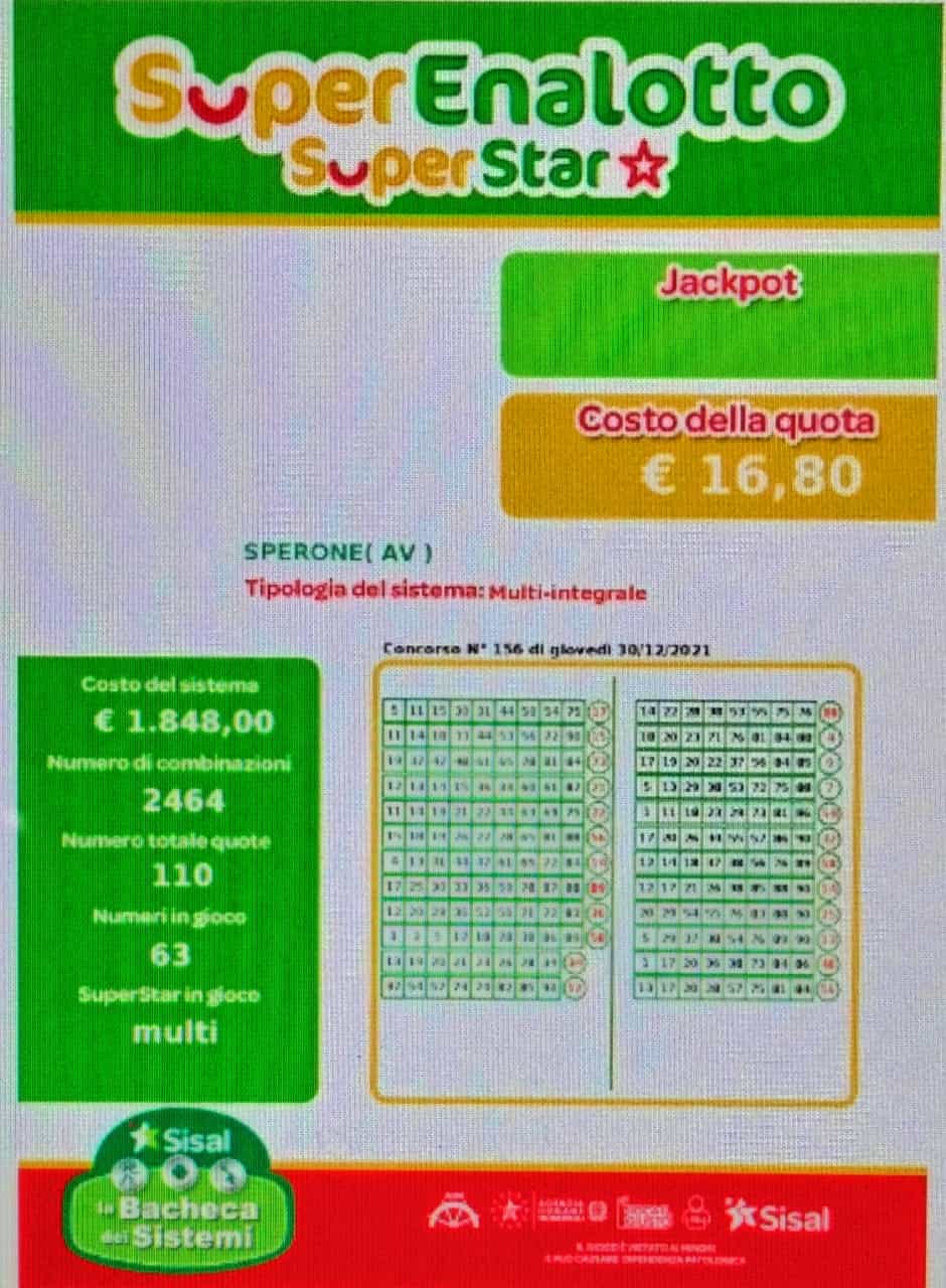 Questa sera potresti festeggiare alla grande il Capodanno che sta per arrivare con una super vincita da centinaia di milioni di euro, basta prenotare una quota da 16,80 per centrare il 6 al SuperEnalotto, estrazione di questa sera, giovedì 30 dicembre 2021. Il sistemone prevede ben 2464 combinazioni con 63 numeri in gioco. Chiama il 335 72 78 512 e blocca la tua quota entro le 19. Buon 2022 con la ricevitoria di AustusBar di Sperone.