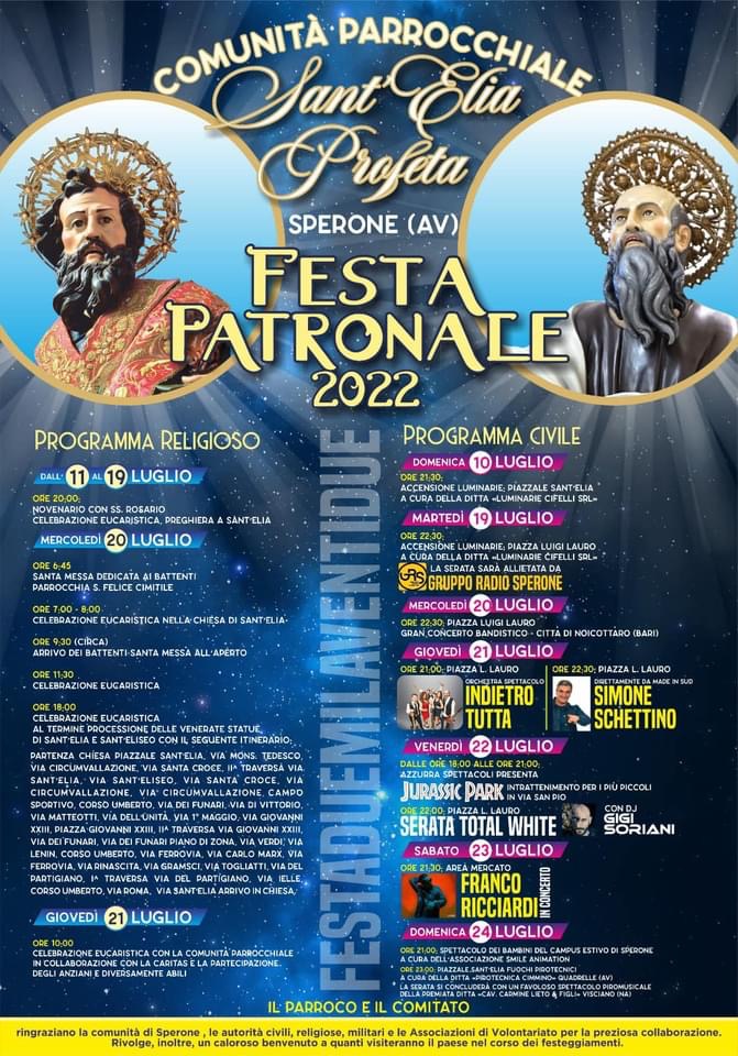 SPERONE. Ecco il programma civile e religioso della festa Patronale di Sant’Elia