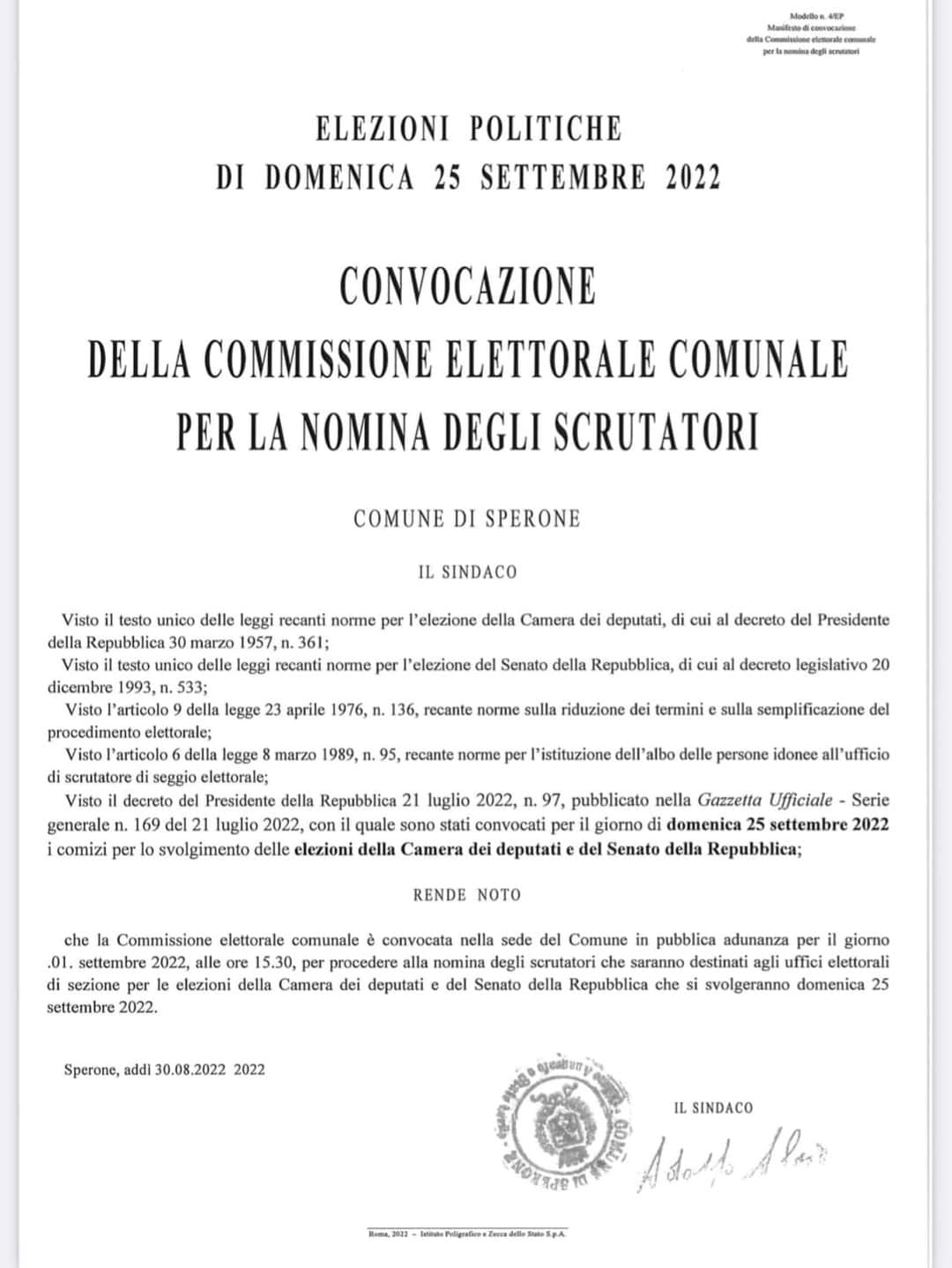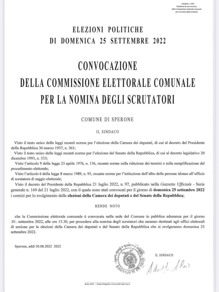 E’ stata convocata per il giorno 1 Settembre alle ore 15.30 presso la sede del Comune di Sperone, in pubblica adunanza, la Commissione elettorale comunale per procedere alla nomina degli scrutatori che saranno destinati agli uffici elettorali di sezione per le elezioni della Camera dei deputati e del Senato della Repubblica che si svolgeranno domenica 25 settembre 2022.
