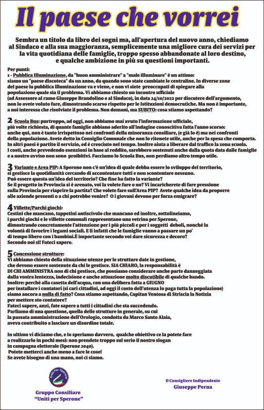 Con un manifesto pubblico dal titolo “Il paese che vorrei”, affisso in paese, il gruppo di opposizione “Uniti per Sperone”, elenca le priorità che l’amministrazione Alaia dovrebbe perseguire. “La nostra idea di paese è semplice, abbiamo notato che la maggioranza trova fondi per tutto, mai per le vere esigenze di Sperone.