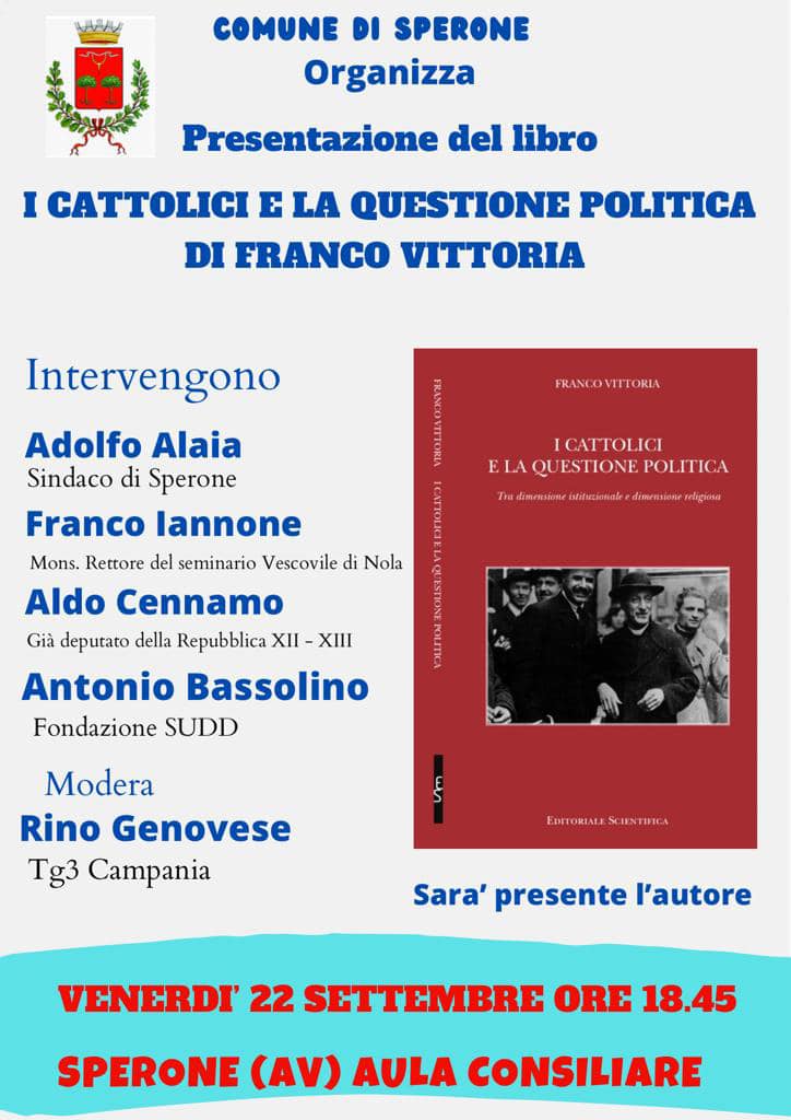 L’obiettivo del libro scritto da Franco Vittoria “I cattolici e la questione politica” vuole contribuire a far emergere il cammino del cattolicesimo politico – dalle encicliche sociali, attraverso la dimensione istituzionale e religiosa, fino alla costruzione del pensiero cattolico da Maritain a Luigi Sturzo. Franco Vittoria insegna istituzioni politiche presso il dipartimento di scienze politiche Università Federico II, e venerdì alle 18,45 nella sua Sperone presenta il suo ultimo lavoro editoriale.