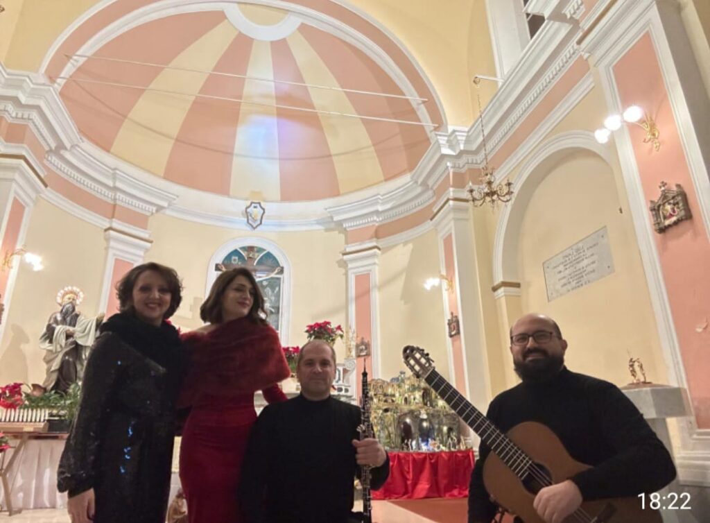Grande successo e unanimi consensi per il concerto che si è tenuto questa sera nella Chiesa di Sant’ Elia di Sperone promosso ed organizzato dalla Pro Loco. Ad esibirsi in un repertorio ricercato La Parthenope Cordes Ensemble formata da Maria Sirignano voce narrante, Orsola Russo Mezzosoprano, Vincenzo Frappola alla Chitarra e Giuseppe Russo all’ Oboe. Applausi per i classici napoletani, tra cui spiccava O marenariello, Lo cardillo e la delicata e sognante A’ vucchella di F.P.Tosti. Commozione e coinvolgimento per Stille Nacht e White Christmas, che hanno immerso il pubblico nella tradizionale atmosfera natalizia. Suggestiva la chiesa in cui era possibile ammirare l’antica cappella dedicata a Sant’ Elia, illuminata e visitabile per l’ occasione. Presenti i rappresentanti dell’ istituzioni civili e religiose, che hanno espresso parole di profondo apprezzamento per il repertorio proposto e per l’alto livello delle professionalità che si sono esibite. Splendida l’accoglienza riservata agli artisti da parte della Pro loco che li hanno omaggiati con applausi, elogi e omaggi floreali.