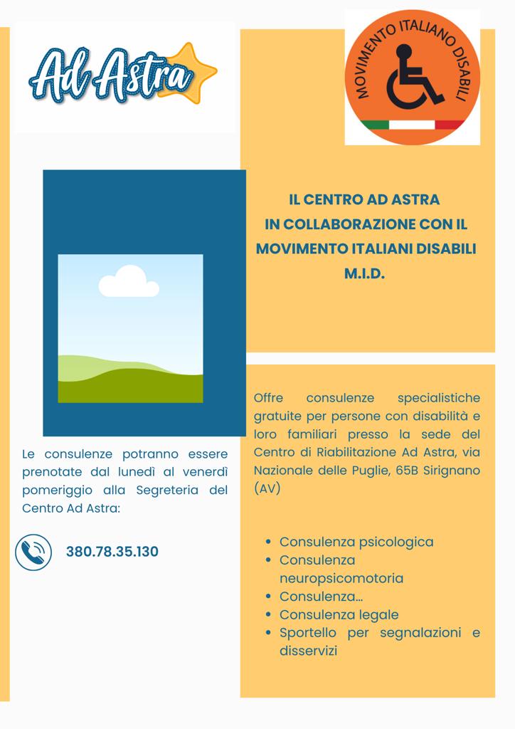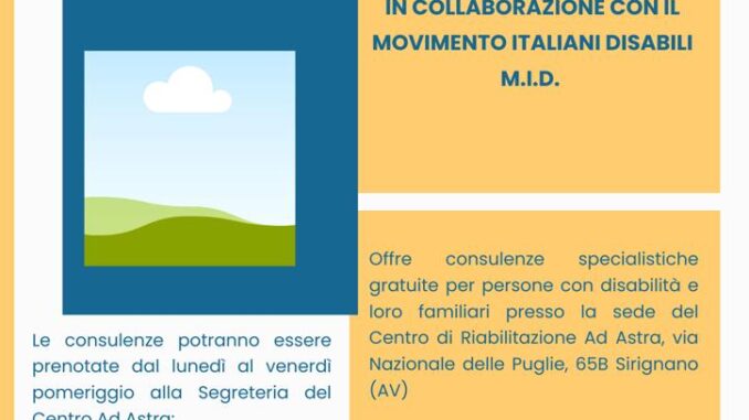 Nel mese di novembre, il territorio di Sirignano vedrà l’apertura di uno “Sportello d’Ascolto” dedicato a persone con disabilità e alle loro famiglie. Questa iniziativa è il risultato di una collaborazione tra il centro Ad Astra, il Mid, con il patrocinio morale del Comune di Sirignano. Lo scopo principale di questo progetto è migliorare la qualità di vita dei soggetti diversamente abili attraverso un primo ascolto caratterizzato da accoglienza e orientamento.