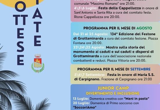 Valorizzazione delle feste della tradizione quali il Festone che giunge alla 134esima edizione, la Festa della Cappelluzza, la Festa di Carpignano, eventi di intrattenimento musicale, sport, raduni per appassionati di auto d’epoca, festa del volontariato, mostre storiche e grande attenzione ai bambini con laboratori creativi e molte altre attività, questo, in sintesi, il cartellone estivo che da giugno a settembre offrirà momenti di svago ai grottesi e a quanti arriveranno da fuori.