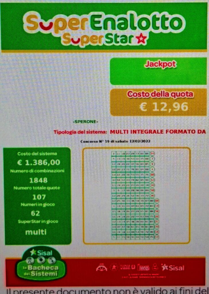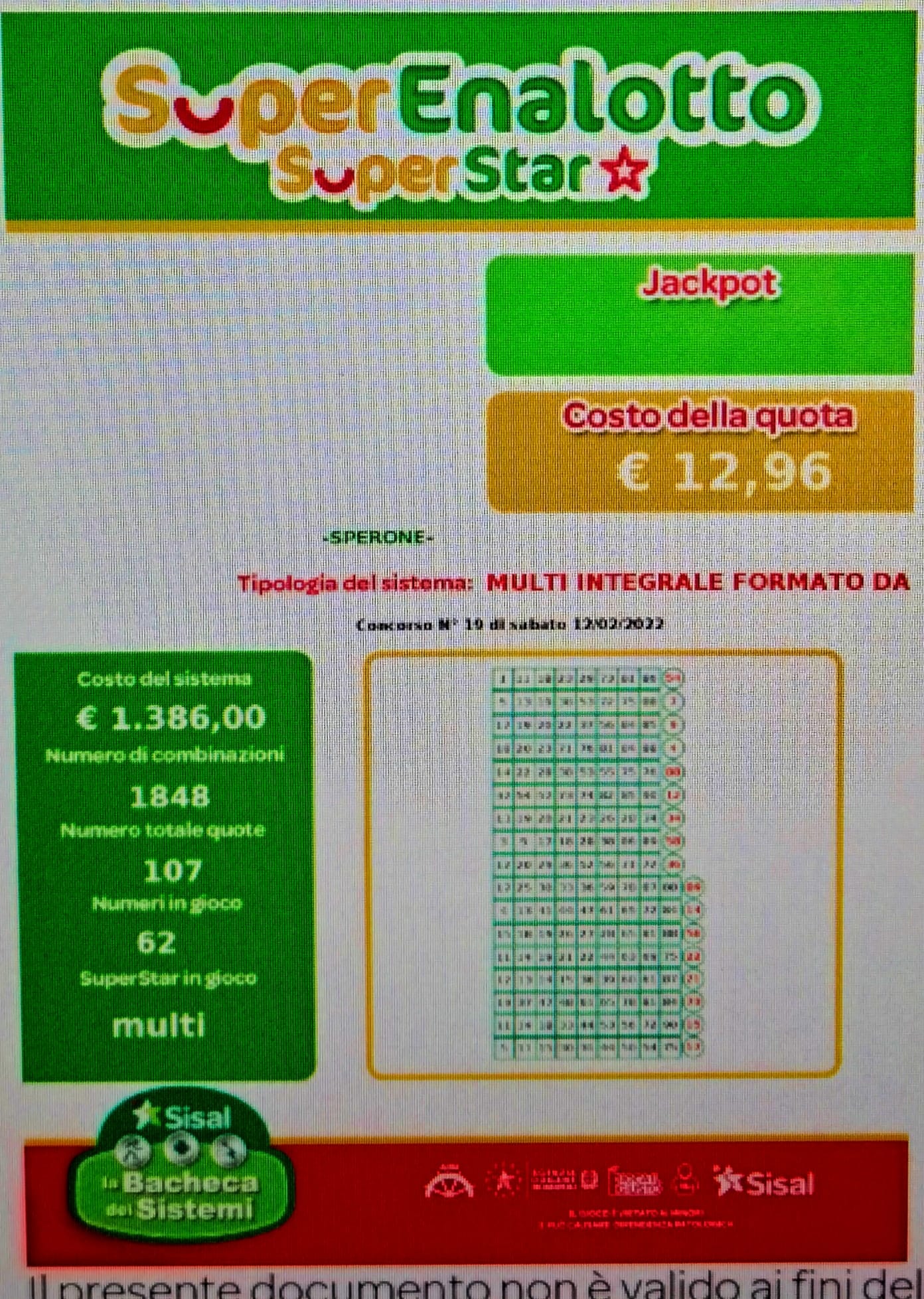 Continua la caccia al 6 ultramilionario, ben 155 milioni, per sbancare il Superenalott. A Sperone, presso la ricevitoria AugustusBar, è stato stilato un sistemone speciale che vede 62 numeri alternarsi. Sono 102 le quote messe in vendita al costo di 12,96 euro ognuna. Ritira la tua quota e vinci con noi.