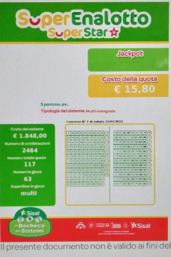 Nuovo sistemone messo a punto dalla ricevitoria dell’AugustusBar di Sperone dove per l’estrazione di questa sera è stato studiato un sistemone per tentare di sbancare il montepremi che ha superato i 140 milioni di euro. Sono ben 2464 le combinazioni in gioco con 63 numeri in gioco. Le quote 117 al costo di 15,80 euro ciascuna. Chi fosse interessato potrà recarsi presso la ricevitoria oppure prenotare la propria quota al numero 335 72 78 512. Buona Fortuna a tutti.