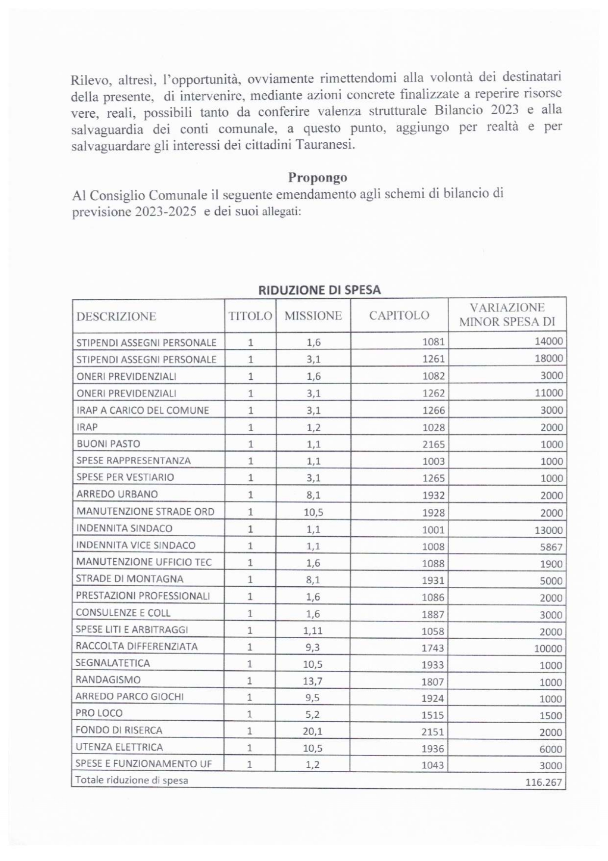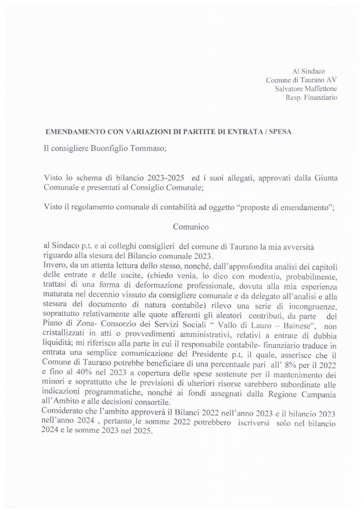 l Consigliere di Maggioranza Tommaso Buonfiglioesprime il voto contrario al Bilancio di Previsione 2023, invece Michele Buonfiglio  capo della minoranza ha votato a favore del bilancio. Altri due   della maggioranza Ferraro Valentino e Ferraro Angelo hanno votato contro. Ecco il perchè del voto contrario di Tommaso Buonfiglio nella sua comunicazione indirizzata al resto della maggioranza consiliare e i particolare al sindaco di Taurano Salvatore Maffettone.