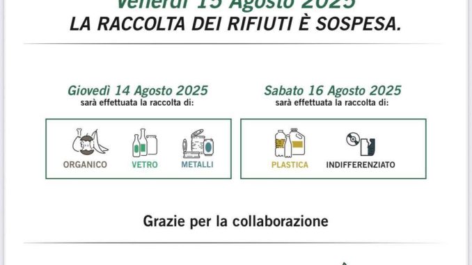 In un comunicato diffuso giovedì mattina, le autorità comunali hanno reso noto che la raccolta prevista per il giorno festivo sarà riorganizzata nei due giorni adiacenti. In particolare, giovedì 14 agosto verrà effettuato il ritiro dell’organico e del vetro, mentre sabato 16 agosto saranno raccolti metalli, plastica e indifferenziato.