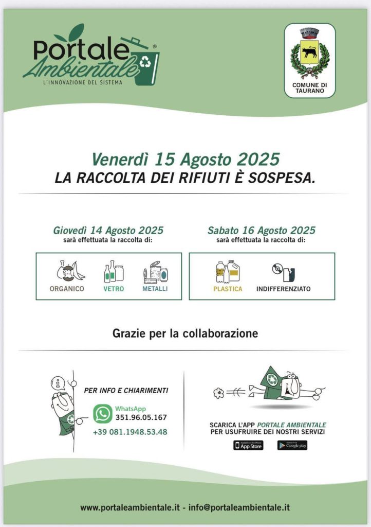 Il Comune di Taurano ha annunciato una temporanea sospensione della raccolta dei rifiuti per venerdì 15 agosto 2025, in occasione della festività di Ferragosto. L’interruzione del servizio, gestito attraverso il Portale ambientale, è stata comunicata con anticipo per permettere ai cittadini di adeguarsi al nuovo calendario.