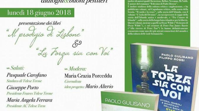 Lunedì 18 giugno, alle ore 18.30, il salone dell’istituto comprensivo di Telese Terme – Solopaca ospiterà l’ultimo appuntamento inserito nel ciclo degli aperitivi letterari “dialoghi&buonipensieri”. Ospiti della serata saranno Paolo Gulisano e Rita Pacilio. La serie di presentazioni è legata all’idea progetto di Mario Alterio e la cui finalità è stata quella di proporre momenti di incontro – confronto nel segno dello scambio e della condivisione culturale. Ancora una volta ci saranno delle sorprese a fare da cornice ma la parte riservata a quello che è ormai divenuto una sorta di salottino letterario vedrà ospiti, come già detto, Paolo Gulisano e Rita Pacilio.