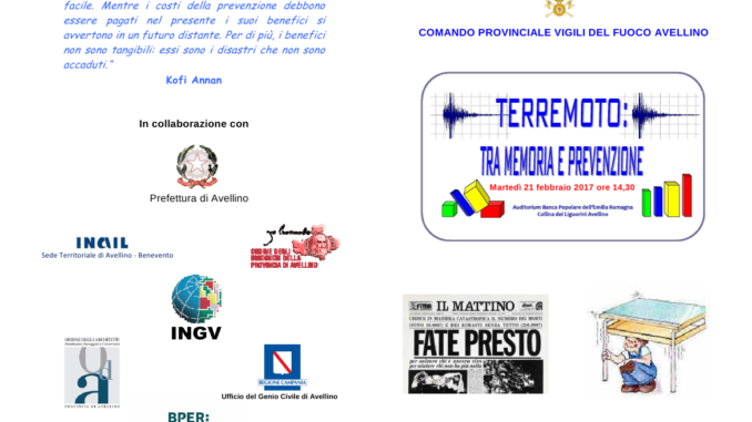 Si comunica che il Convegno ” Terremoto tra memoria e prevenzione” previsto per il 10 gennaio 2017 e annullato a causa della neve, si terrà il giorno martedì 21 febbraio con inizio alle ore 14,30 presso l’Auditorium della Banca Popolare Emilia Romagna, Collina Liquorini Avellino.
