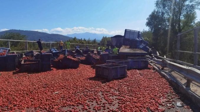 Secondo le prime ricostruzioni, il tir ha perso parte del carico, lasciando cadere sull’asfalto numerose casse di pomodori. La carreggiata è stata in breve tempo invasa dai prodotti, creando difficoltà alla circolazione e obbligando gli automobilisti a procedere con estrema cautela.