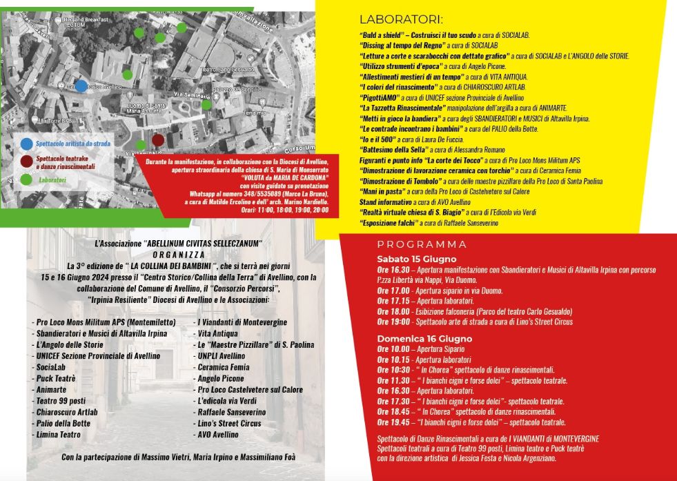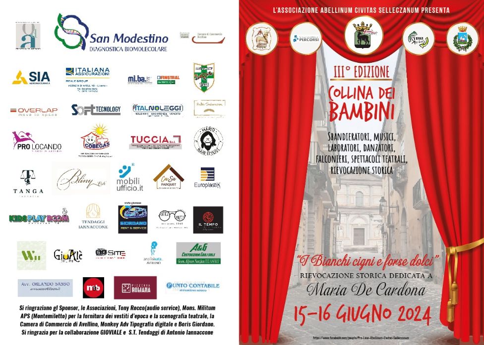 Tutto pronto per l’apertura del sipario sul Centro storico di Avellino che quest’anno si trasformerà nel grande teatro della collina dei bambini ,per riportare grandi e piccini nel Rinascimento ,epoca in cui è vissuta una delle personalità più importanti dell’epoca ,Maria de Cardona feudataria che nel 1513 ricevette in eredità la contea di Avellino, favorendone  il rinnovamento , la  rinascita industriale e commerciale, il suo risveglio culturale e trasformando il Castello in una magnifica residenza gentilizia, dove dimorò a lungo. La manifestazione sarà presentata il 12 giugno ,giornata internazionale contro lo sfruttamento del lavoro minorile ,alle ore 11:00 presso la sala riunioni della camera di commercio in piazza Duomo. Alla conferenza stampa moderata da Paolo Matarazzo ,parteciperanno Amalia Benevento comitato provinciale Unicef Avellino,l’ architetto del Ministero dei Beni e delle Attività culturali Marino Nardiello  diocesi di Avellino, Nicola Argenziano e Jessica Festa referenti delle rappresentazioni teatrali ,infine Gianni Maffei rappresentante della proloco Abellinum Civitas- selleczanum, l’ associazione che ha ideato e organizzato la terza edizione della “collina dei bambini ,che vede un programma ricco di laboratori ed eventi e realizzata grazie al contributo  di numerosi sponsor che credono nell’iniziativa e nella valorizzazione del territorio.