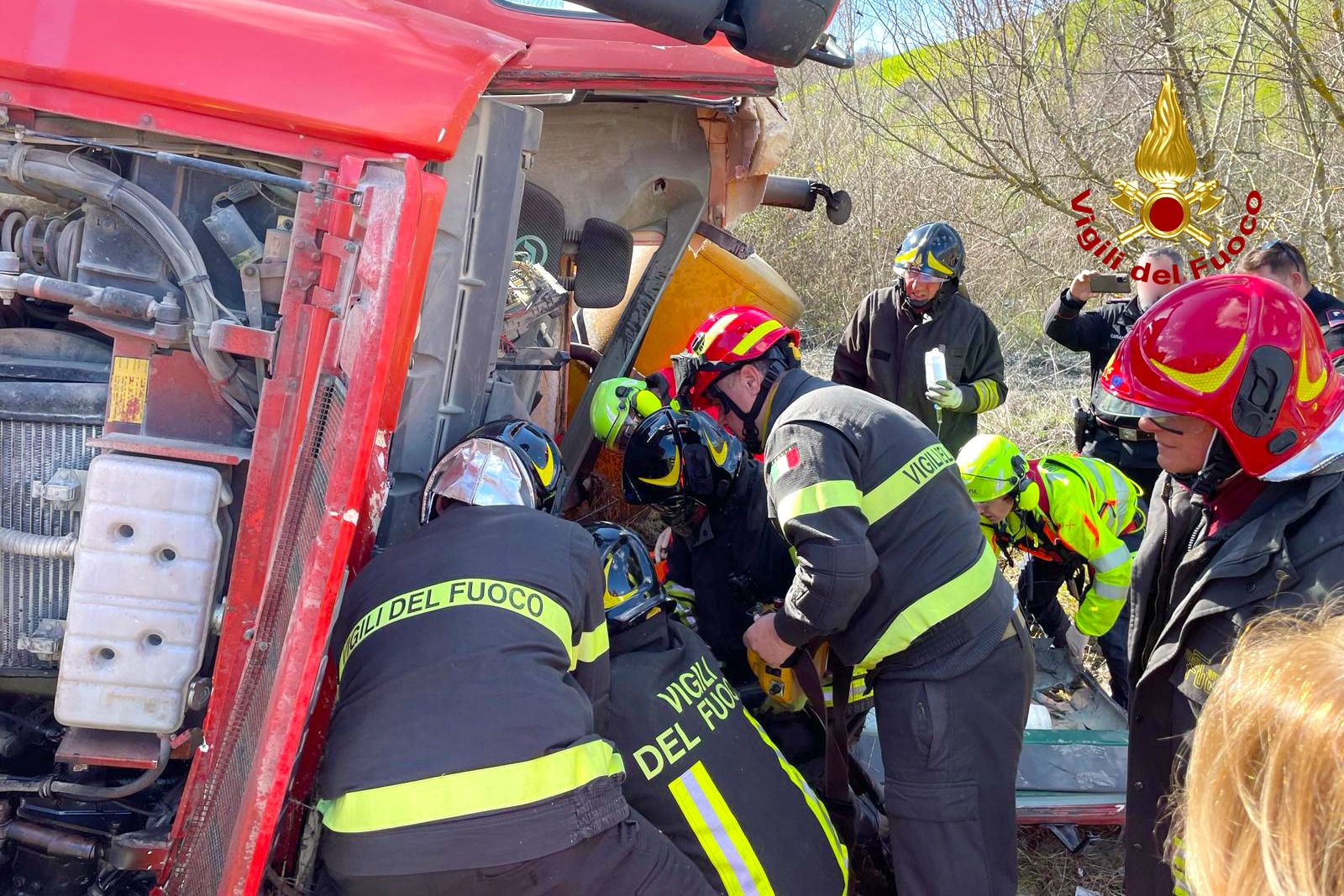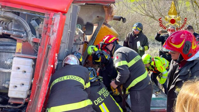 L’incidente è avvenuto quando la betoniera è uscita di strada, precipitando nella scarpata sottostante e ribaltandosi, con l’uomo alla guida ancora al suo interno. La gravità della situazione ha richiesto l’intervento dell’autogru dalla sede centrale di Avellino, che con non poche difficoltà è riuscita a liberare l’uomo intrappolato sotto il pesante automezzo.