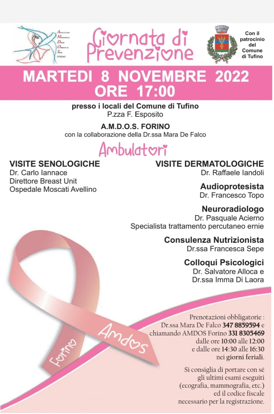 Martedì 8 novembre 2022 a Tufino, presso i locali della casa comunale a partire dalle 17 si volgerà un pomeriggio di prevenzione grazie all’associazione AMDOS Forino. Una grande opportunità per tutti, con la possibilità, previa prenotazione obbligatoria, di sottoporsi a visite gratuite con gli specialisti che hanno dato la loro disponibilità
