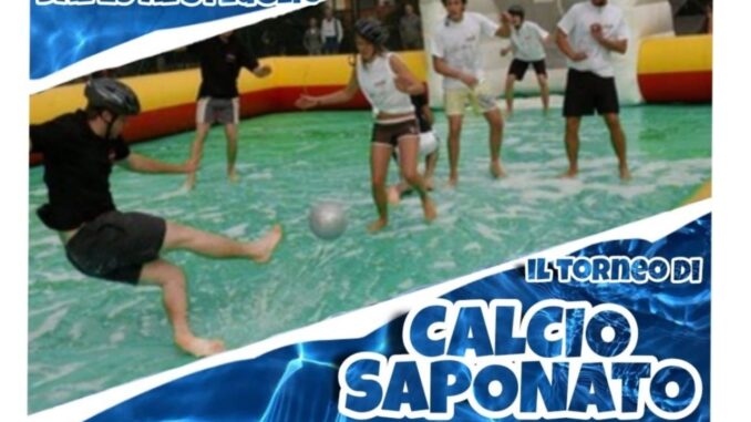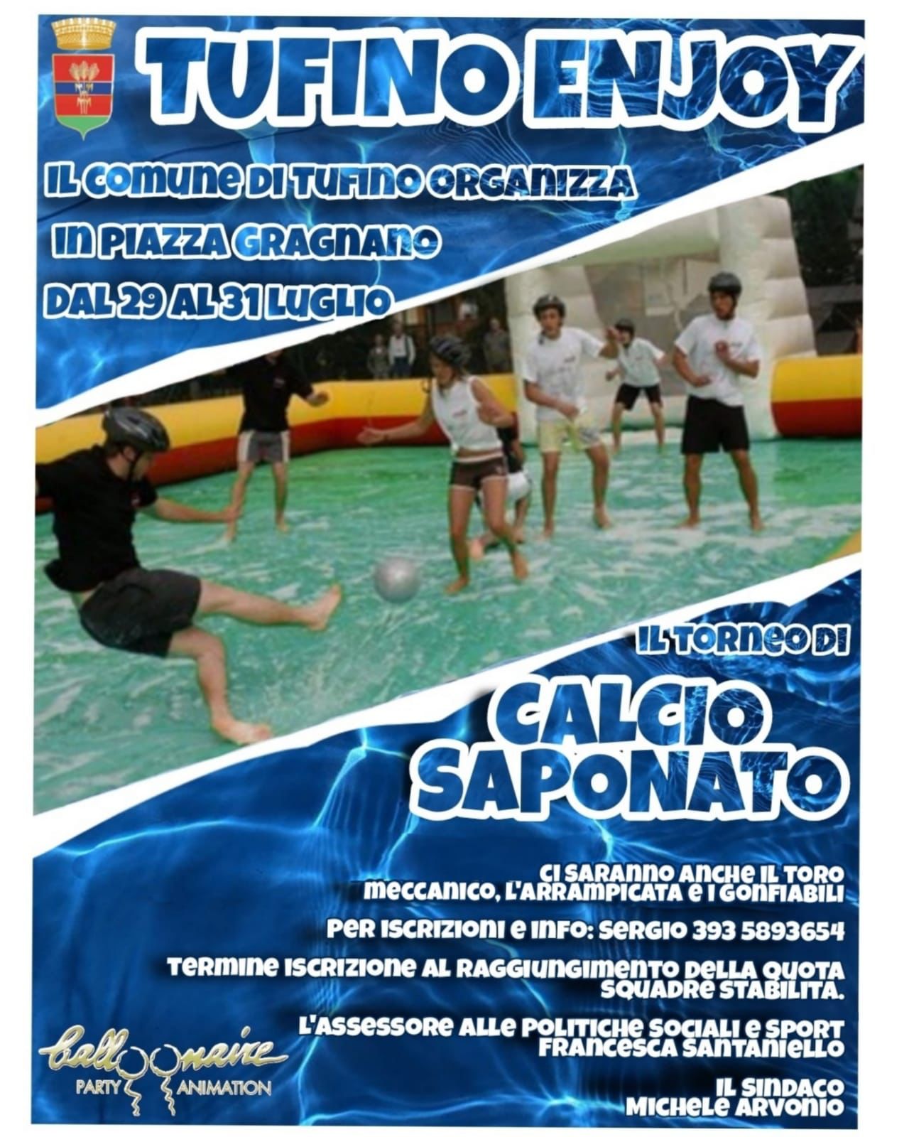 A Tufino dal 29 al 31 luglio in piazza Gragnano va in scena il primo Torneo di “Calcio Saponato”. Si tratta di un classico campo da calcetto, delimitato da porte gonfiabili e sponde alte circa 0,70 m, i bordi gonfiabili consentono e garantiscono la massima sicurezza durante le partite. Il campo è un telo di PVC lavorato, sulla quale viene messo uno strato di acqua mischiata con un pò di sapone. Per giocare è necessario l’utilizzo del caschetto di protezione.