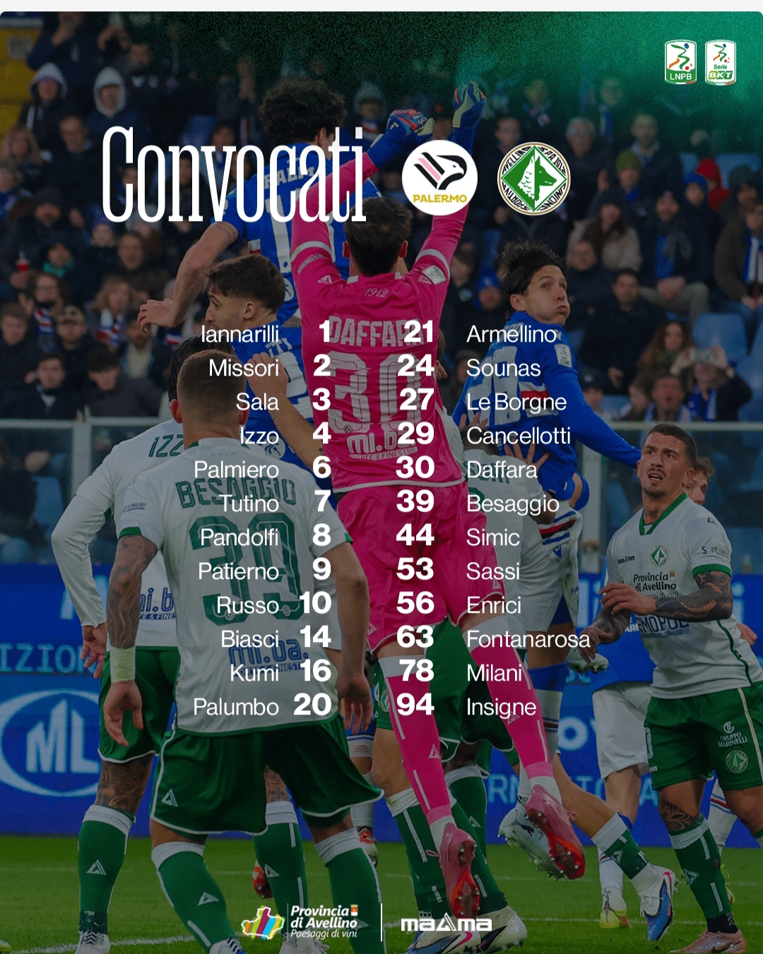 1 Iannarilli, 2 Missori, 3 Sala, 4 Izzo, 6 Palmiero, 7 Tutino, 8 Pandolfi, 9 Patierno, 10 Russo, 14 Biasci, 16 Kumi, 20 Palumbo, 21 Armellino, 24 Sounas, 27 Le Borgne, 29 Cancellotti, 30 Daffara, 39 Besaggio, 44 Simic, 53 Sassi, 56 Enrici, 63 Fontanarosa, 78 Milani, 94 Insigne. U.S. Avellino. I convocati per il match di Palermo a Pasqua