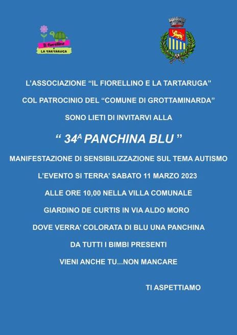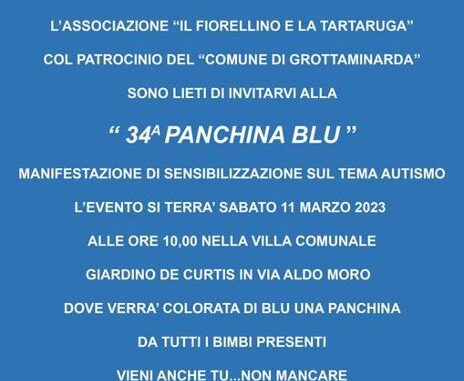 La manifestazione è promossa dall’Associazione “Il Fiorellino e la Tartaruga” che è giunta alla sua 34esima panchina blu e dal Comune di Grottaminarda.
