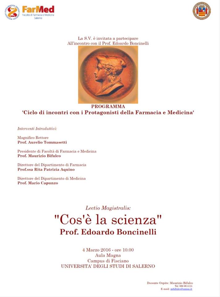 Nella mattinata del 4 Marzo, si terrà presso l’Aula Magna del Campus di Fisciano, il nuovo appuntamento della serie di eventi: “Ciclo di incontri con i Protagonisti di Farmacia e Medicina”. Ospite speciale della giornata il Prof. Edoardo Boncinelli con la sua Lectio Magistralis: “Cos’è la Scienza”.