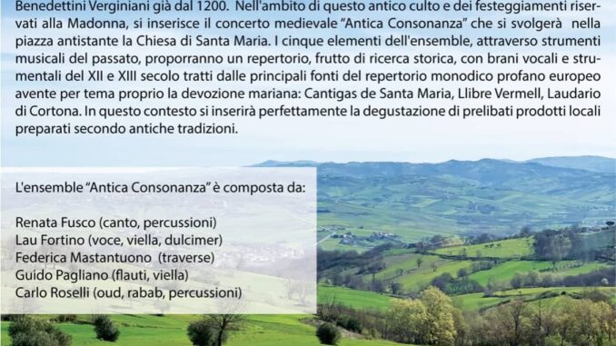 La devozione per Maria a Vallata è antica e profonda, si sviluppa soprattutto con la presenza dei Benedettini Verginiani già dal 1200. Nell’ambito di questo antico culto e dei festeggiamenti riservati alla Madonna, si inserisce il concerto medievale “Antica Consonanza” che si svolgerà nella piazza antistante la Chiesa di Santa Maria. I cinque elementi dell’ensemble, attraverso strumenti musicali del passato, proporranno un repertorio, frutto di ricerca storica, con brani vocali e strumentali del XII e XIII secolo tratti dalle principali fonti del repertorio monodico profano europeo avente per tema proprio la devozione mariana: Cantigas de Santa Maria, Llibre Vermell, Laudario di Cortona.