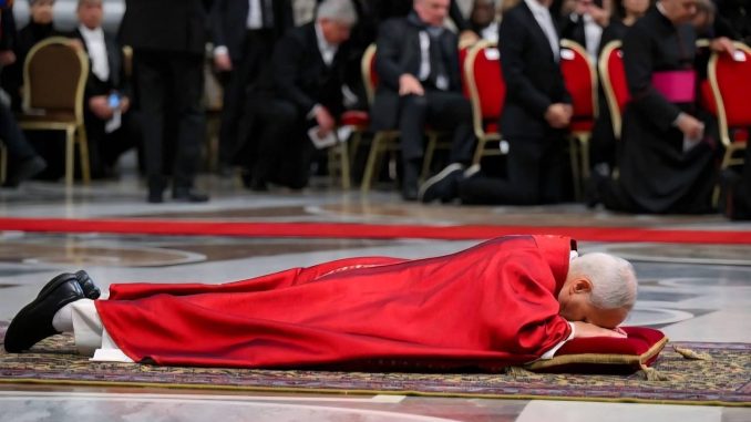 Il Pontefice, secondo la tradizione, ha vissuto la liturgia della Passione del Signore in atteggiamento di umiltà e adorazione: prima prostrato davanti all’altare, poi in ginocchio e a piedi scalzi davanti alla Croce, segno di totale abbandono al mistero della sofferenza e della redenzione.