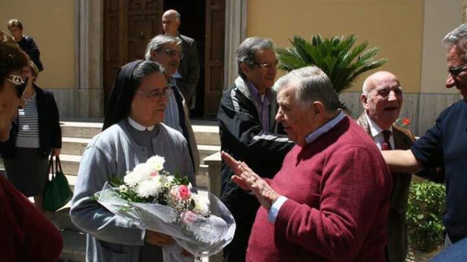 È stato uno dei primi alunni di Padre Arturo ad entrare nell’Opera da Lui fondata nel dopoguerra a VISCIANO. Pasquale Cutolo, meglio conosciuto come Pasqualino, che nella foto vediamo con madre Nunzia, attuale superiore generale delle suore Piccole Apostole della Redenzione, aveva superato le ottantina d’anni e da alcuni di questi anni viveva con la sua famiglia. È stato per lunghi anni timoniere e responsabile della tipografia “Anselmi” di MARIGLIANO, fondata da Padre Arturo nell’istituto in cui gli orfanelli, una volta giovanissimi imparavano un mestiere oltre al tipografo, come il falegname, marmista, fabbro ed altro. Pasqualino è stato sempre un insegnante ferreo verso quei giovani che volevano imparare il mestiere. A Padre Arturo non esitava a chiedere i giusti consigli come le varie pubblicazioni edite dalla LER Libreria Editrice Redenzione, come lo stesso mensile dell’Opera e i vari libri che Padre Arturo scriveva e pubblicava durante l’anno. Sempre presente alle varie iniziative dell’associazione EX ALLIEVI come i ritiri e VISCIANO con Ariosto, Pellegrino Gambardella ed altri ex orfanelli della Piccola Opera. Nicola Valeri