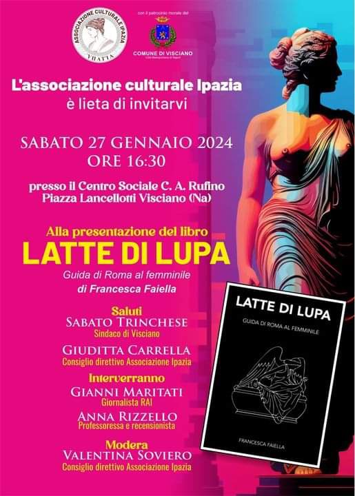 L’evento di Visciano è stato organizzato dall’associazione culturale Ipazia e vedrà la partecipazione del Sindaco di Visciano Sabato Trinchese, di Giuditta Carrella e Valentina Soviero del consiglio direttivo di Ipazia, del giornalista RAI Gianni Maritati e dalla recensionista Anna Rizzello.Visciano: La scrittrice Francesca Faiella presenta il suo nuovo libro Latte di Lupa, guida di Roma al femminile Sabato 27 gennaio 2024 al Centro Sociale C.A. Rufino Visciano: La scrittrice Francesca Faiella presenta il suo nuovo libro Latte di Lupa, guida di Roma al femminile Sabato 27 gennaio 2024 al Centro Sociale C.A. Rufino Visciano: La scrittrice Francesca Faiella presenta il suo nuovo libro Latte di Lupa, guida di Roma al femminile Sabato 27 gennaio 2024 al Centro Sociale C.A. Rufino
