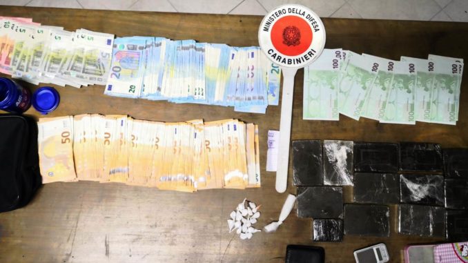 I predetti a seguito di perquisizione domiciliare sono stati trovati in possesso di 1236,5 grammi di hashish suddivisi in 12 panetti, 11,2 grammi di cocaina in dosi e materiale per il confezionamento in dosi insieme a 12.605 euro ritenuti provento di attivita’ illecita. l’uomo è stato tradotto a Poggioreale. la donna agli arresti domiciliari.
