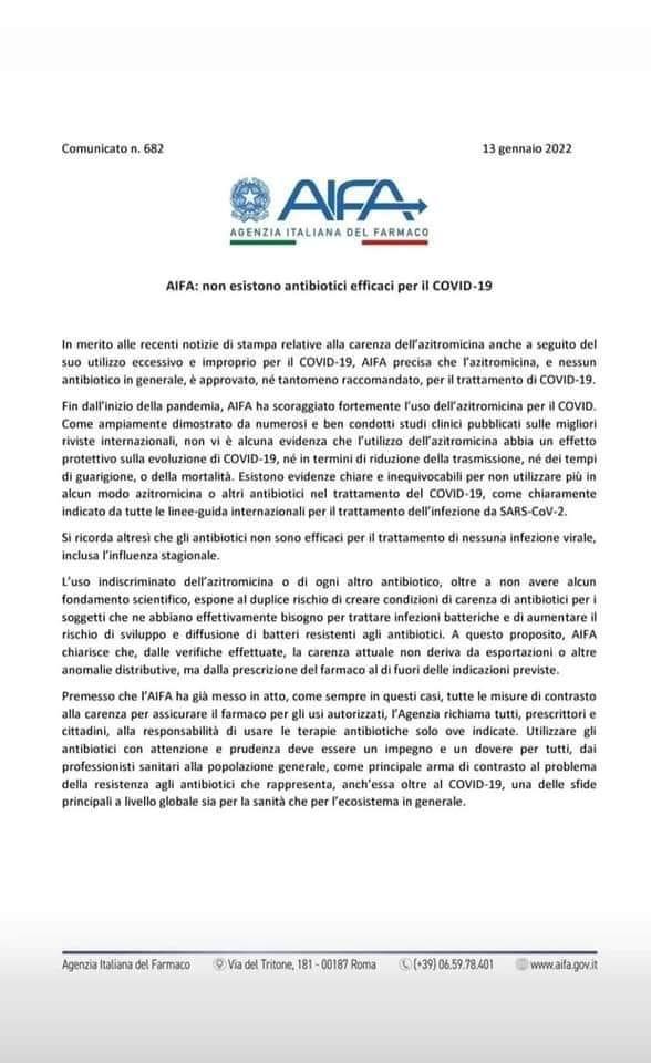 Ma è davvero così? No, affatto. La stessa AIFA in un comunicato è dovuta intervenire ricordando che il farmaco non è parte delle linee guida delle cure contro il covid e che non è assolutamente dimostrata una sua efficacia come terapia contro i sintomi da covid e anzi, raccomanda ai medici di base di prescriverlo solo in alcuni casi, e cioè quando c’è un sospetto di infezione batterica.