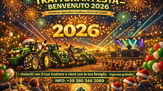Il Comitato Agricoltori Avellinesi M.V.S., che aderisce alCoordinamento Agricoltori e Pescatori Italiani – #COAPI, organizza una serata speciale in cui i protagonisti saranno i trattori illuminati, simbolo del lavoro agricolo e della vita delle nostre comunità. Attraverso suggestive riprese con drone, i mezzi agricoli formeranno il 2025, che verrà simbolicamente sostituito dal 2026, per salutare insieme il nuovo anno con un messaggio di speranza e partecipazione.