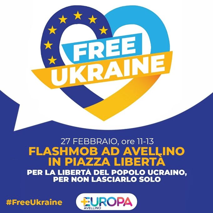 Flashmob ad Avellino questa domenica 27 febbraio ore 11-12 in piazza Libertà (sotto il monumento “Le Ali della Libertà). Ad Avellino abbiamo un’importante comunità con oltre duemila cittadini ucraini ed ucraine residenti in Irpinia. Per mostrare vicinanza ai nostri fratelli e sorelle europei.